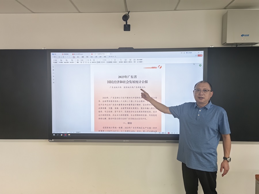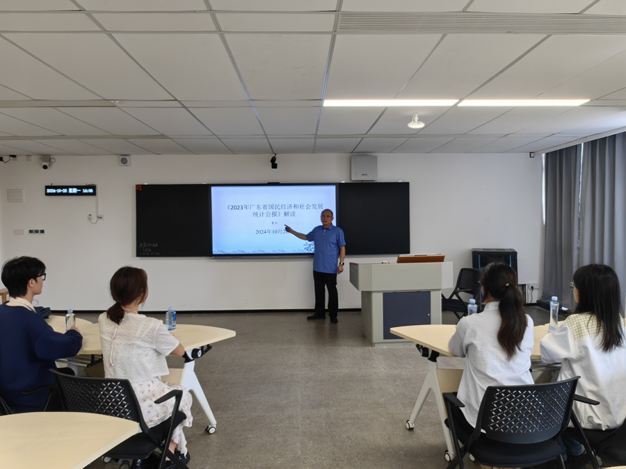 本次沙龙主题为《2023年广东省国民经济和社会发展统计公报》解读。2023年,广东坚持以习近平新时代中国特色社会主义思想为指导,经济运行持续好转、内生动力持续增强、社会预期持续改善、风险隐患持续化解,推动中国式现代化的广东实践迈出坚实步伐。曹博士从综合、农业、工业和建筑业、服务业、国内贸易、固定资产投资、对外经济、财政金融、居民收入消费和社会保障、科学技术和教育、文化、卫生健康和体育、资源、环境和应急管理十二个方面对2023年广东省国民经济和社会发展进行了详细解读,展望了2024年发展预期,并同现场师生进行了热烈讨论和学术交流。